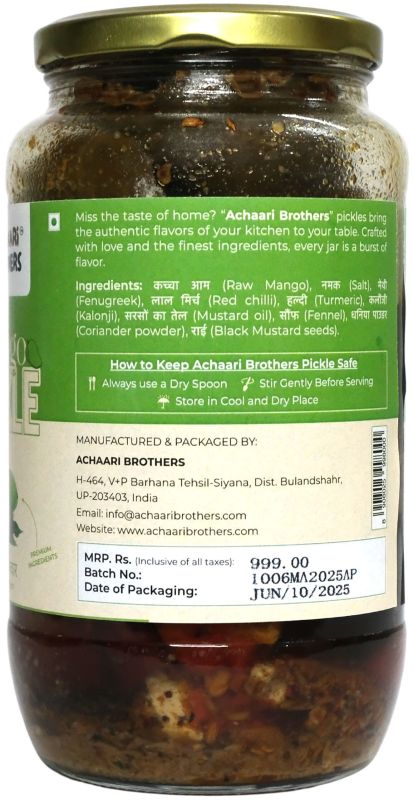 | Ingredients | Mangoes, Mustard Seeds, Turmeric, Red Chili Powder |